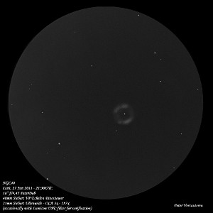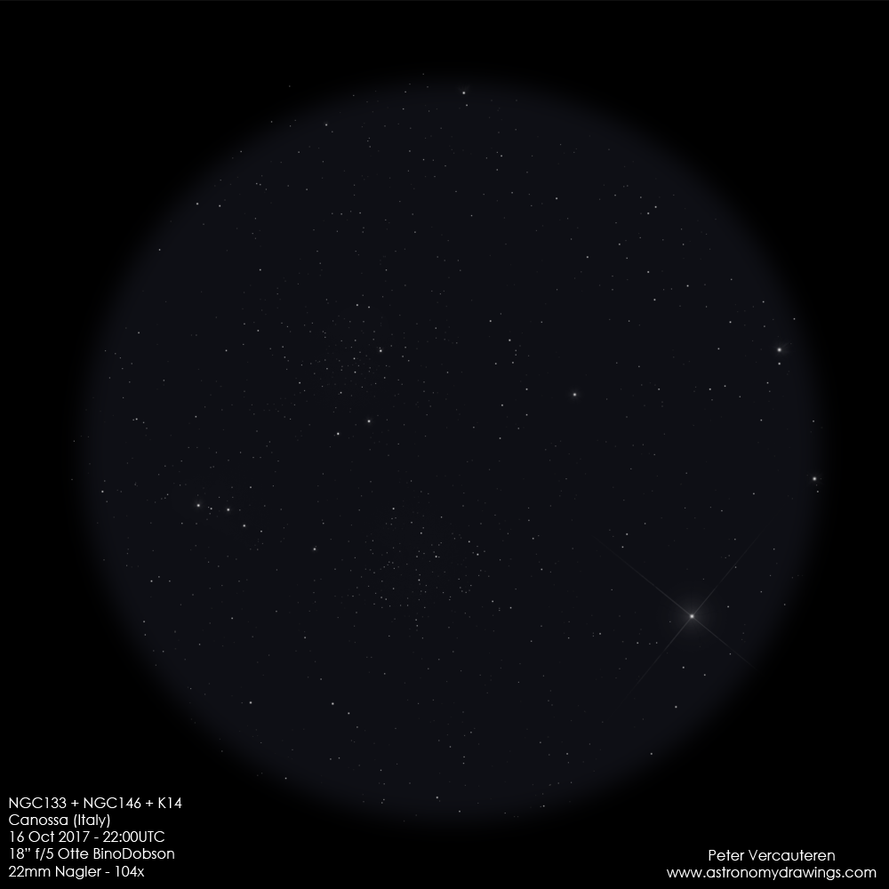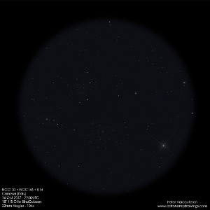 The Cassiopeia Triple Cluster: NGC133 (bottom-left), NGC146 (top-left) and King 14 (bottom). In reality, however, these cluster have nothing to do with each…NGC246 (18in Dobson)