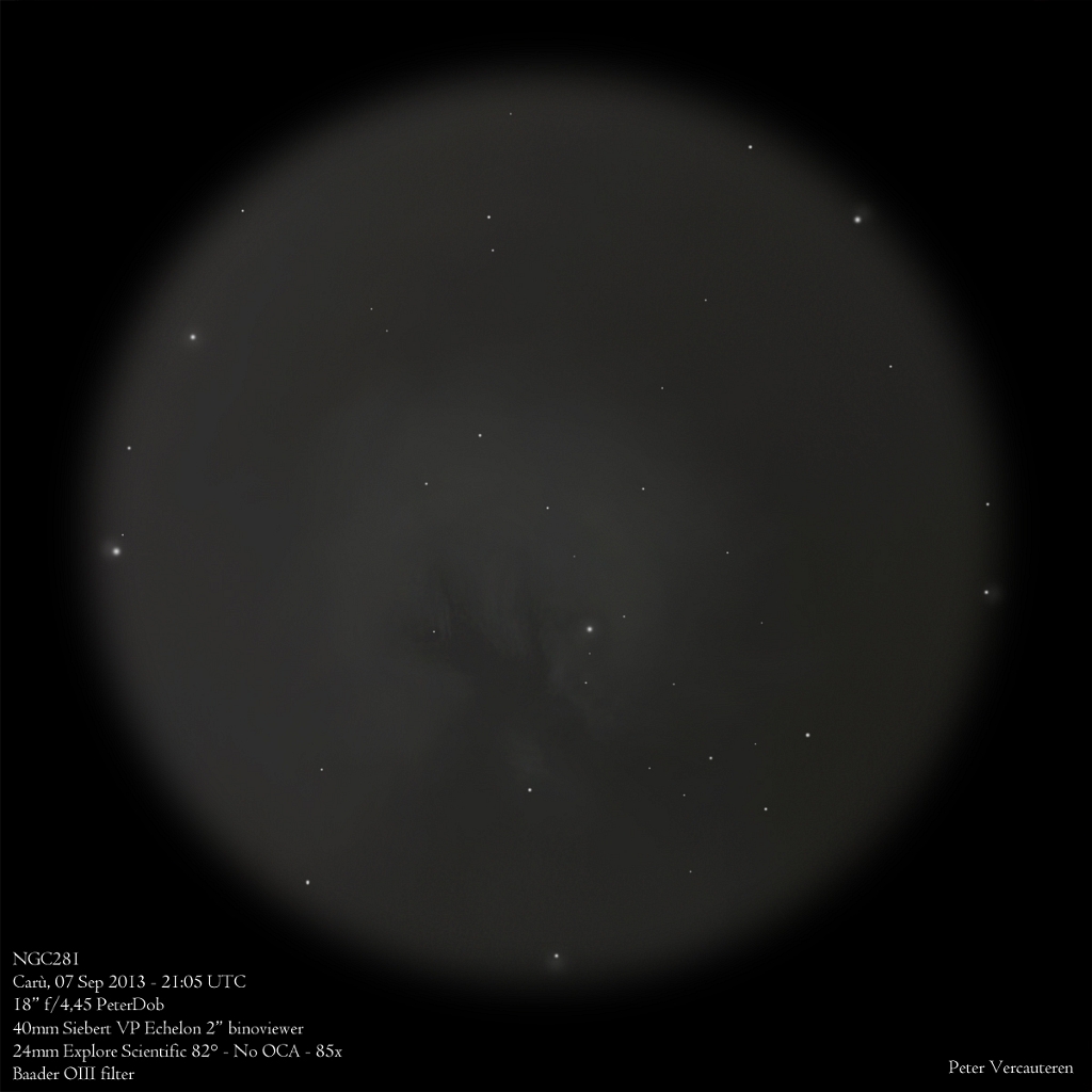 The Sculptor Galaxy (NGC253) is one of the brightest and finest galaxies in the sky. Unfortunately over here in Northern Italy it’s never far above the horizon.NGC281 (18in Dobson)