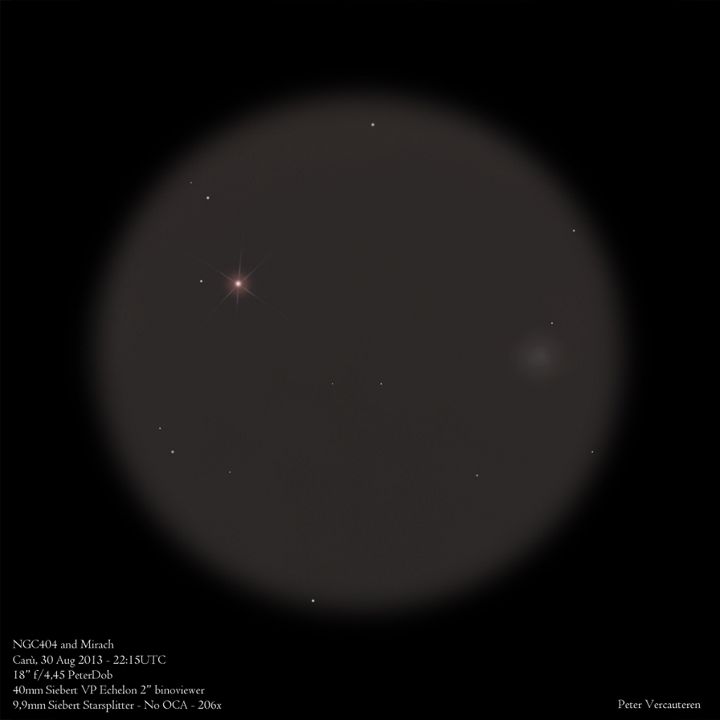 This particular nebula, NGC281, is nicknamed the “Pac Man” nebula and I don’t suppose I have to explain why.NGC404 + Mirach (18in Dobson)