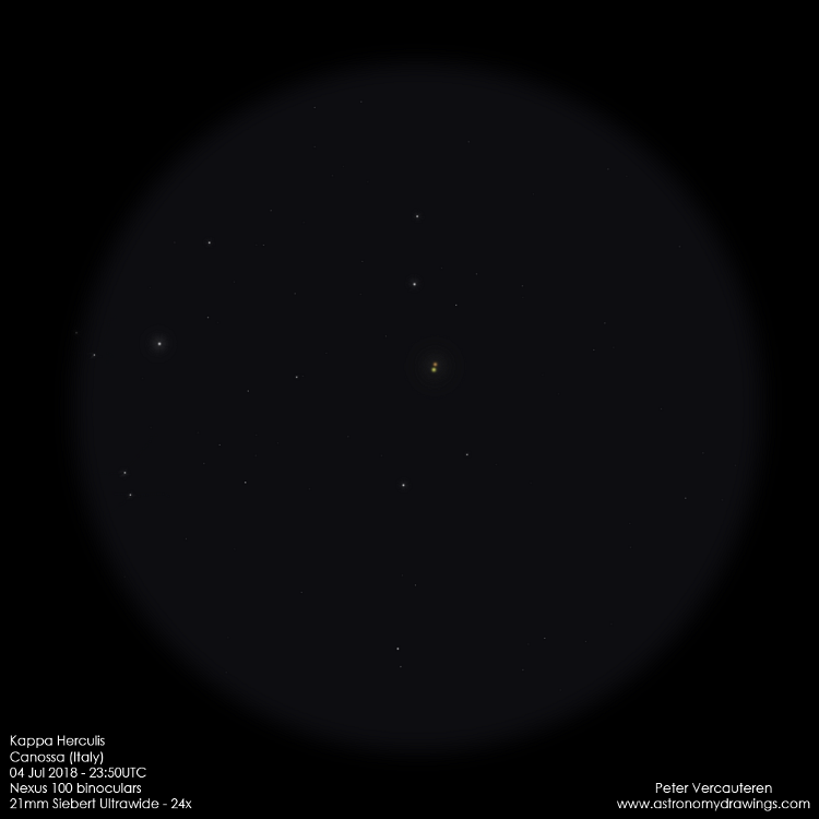 Ras Algethi (Alpha HER) is a woonderful double star that I saw as orange for the main star and green for its companon.Kappa Herculis (Nexus 100)